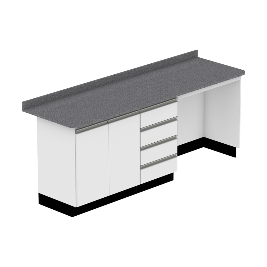 Sistema modular fixo de bancadas para laboratório, personalizável conforme espaço, com alta durabilidade e acabamento técnico-profissional.
